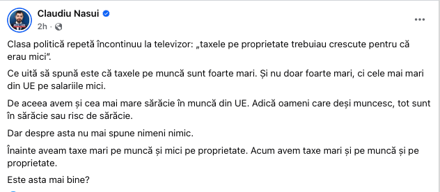Înainte aveam taxe mari pe muncă şi mici pe proprietate. Acum avem taxe mari şi pe muncă şi pe proprietate. Este asta mai bine?”, a scris Claudiu Năsui pe pagina sa de Facebook.