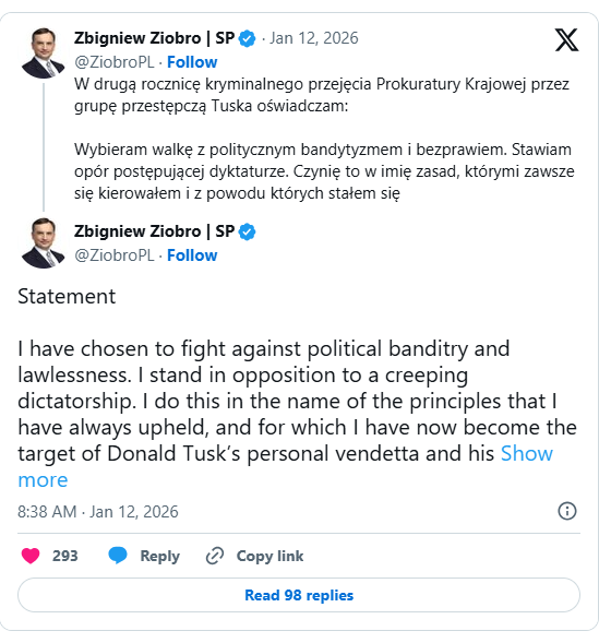 Zbigniew Ziobro, în vârstă de 55 de ani, este vizat de o anchetă pentru abuz de putere şi asociere în scopul săvârşirii de infracţiuni în perioada în care a fost ministru al justiţiei şi procuror general în guvernele PiS, între 2015 şi 2023. Colegii săi deputaţi din Dietă (parlamentul polonez) au votat în noiembrie 2025 ridicarea imunităţii sale parlamentare şi au autorizat plasarea sa în arest preventiv.