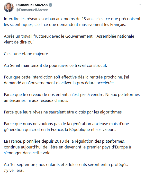 „Am cerut Guvernului să accelereze procesul. Pentru că creierele copiilor noștri nu sunt de vânzare. Nici platformelor americane, nici rețelelelor chineze. Pentru că visele lor nu pot fi dictate de algoritmi. Pentru că nu vrem o generație anxioasă, ci o generație care crede în Franța, Republica și valorile ei”, a scris Emmanuel Macron pe X.