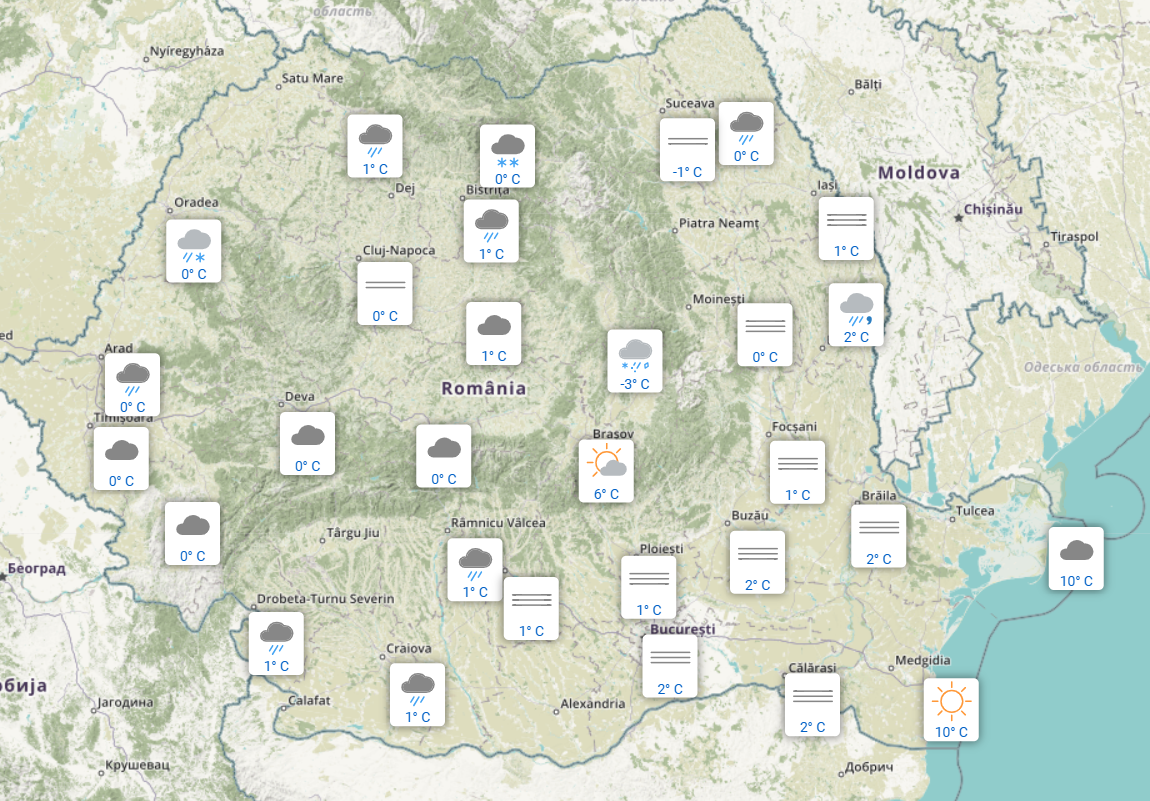 La Brașov au fost 6 grade Celsius, cu cer parțial acoperit, potrivit ANM, iar la Craiova și Drobeta-Turnu Severin a plouat și s-a înregistrat 1 grad Celsius.