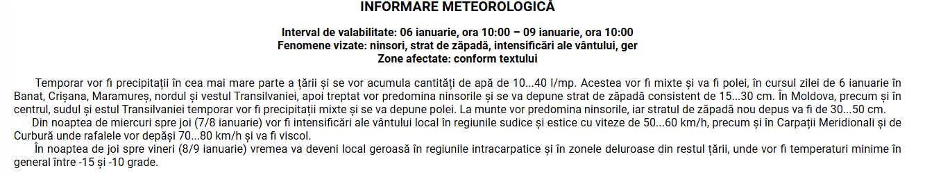 „Temporar vor fi precipitații în cea mai mare parte a țării și se vor acumula cantități de apă de 10…40 l/mp. Acestea vor fi mixte și va fi polei, în cursul zilei de 6 ianuarie în Banat, Crișana, Maramureș, nordul și vestul Transilvaniei, apoi treptat vor predomina ninsorile și se va depune strat de zăpadă consistent de 15…30 cm.