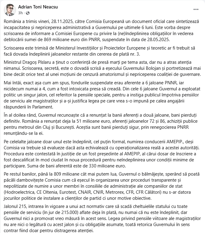 „România a trimis vineri, 28.11.2025, către Comisia Europeană un document oficial care sintetizează incapacitatea și nepriceperea administrativă a Guvernului pe ultimele 6 luni. Este vorba despre scrisoarea de informare a Comisiei Europene cu privire la (ne)îndeplinirea obligațiilor în vederea deblocării sumei de 869 milioane euro din PNRR, suspendate în data de 28.05.2025.”